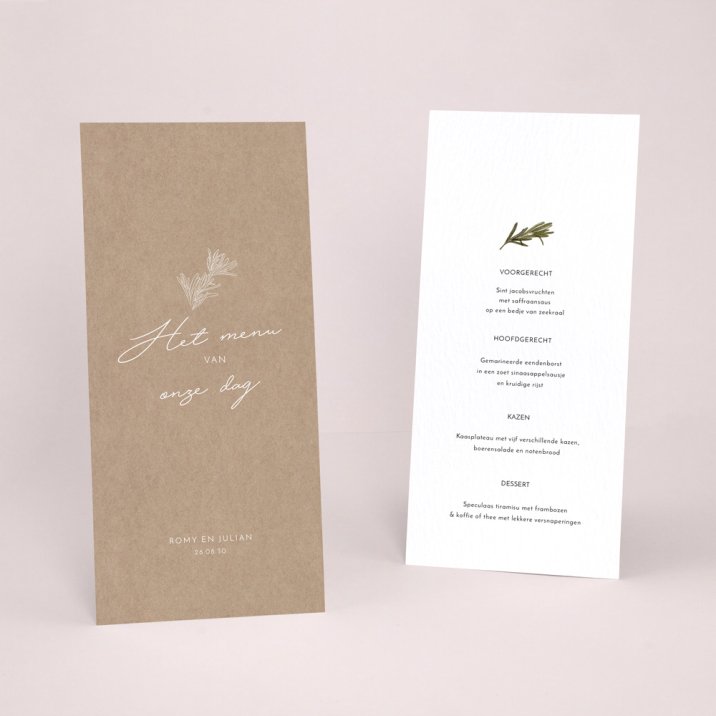 Jullie hebben het menu samengesteld voor de grote dag? Ga voor een menukaart dat bij jullie trouwkaart past!
