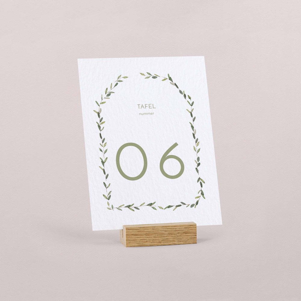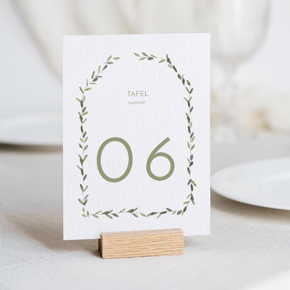 Plaats het tafelnummerkaartje in het midden van de tafel zodat het goed zichtbaar is voor jullie gasten. Zo vinden ze snel hun plek na het aflezen van hun tafelnummer op het tafelplan.