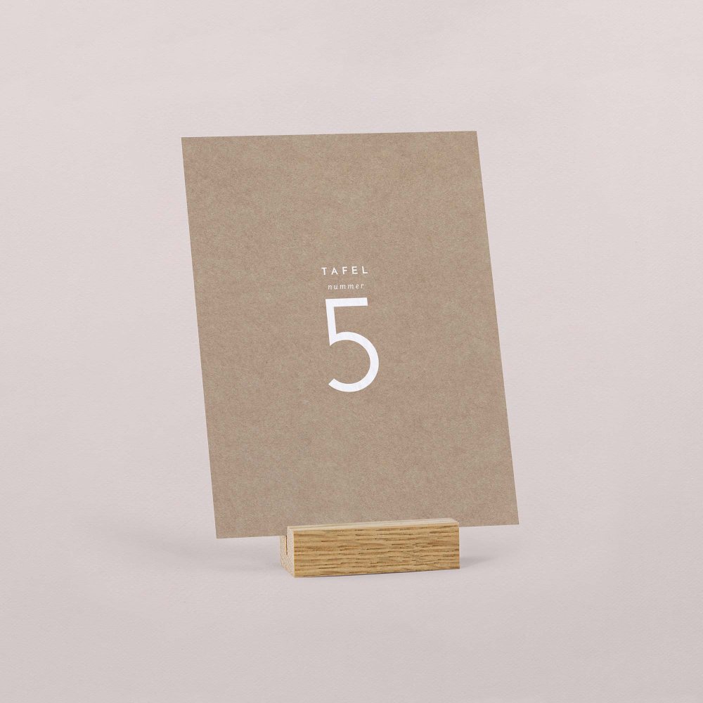 Plaats het tafelnummerkaartje in het midden van de tafel zodat het goed zichtbaar is voor jullie gasten. Zo vinden ze snel hun plek na het aflezen van hun tafelnummer op het tafelplan.