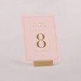 Plaats het tafelnummerkaartje in het midden van de tafel zodat het goed zichtbaar is voor jullie gasten. Zo vinden ze snel hun plek na het aflezen van hun tafelnummer op het tafelplan.