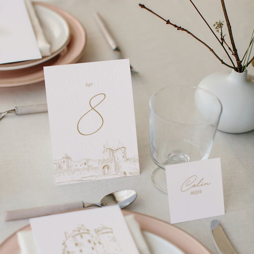 Plaats het tafelnummerkaartje in het midden van de tafel zodat het goed zichtbaar is voor jullie gasten. Zo vinden ze snel hun plek na het aflezen van hun tafelnummer op het tafelplan.