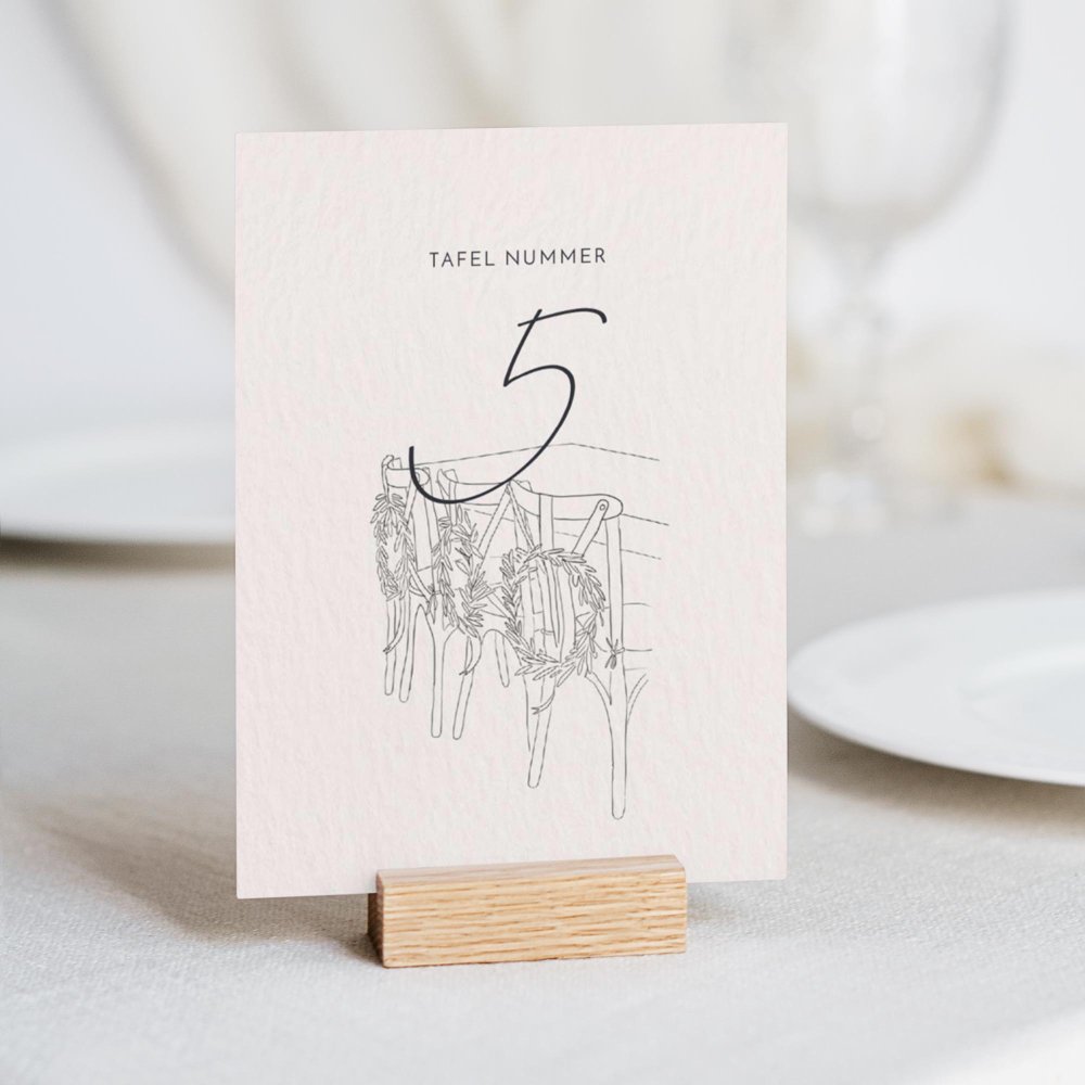 Plaats het tafelnummerkaartje in het midden van de tafel zodat het goed zichtbaar is voor jullie gasten. Zo vinden ze snel hun plek na het aflezen van hun tafelnummer op het tafelplan.
