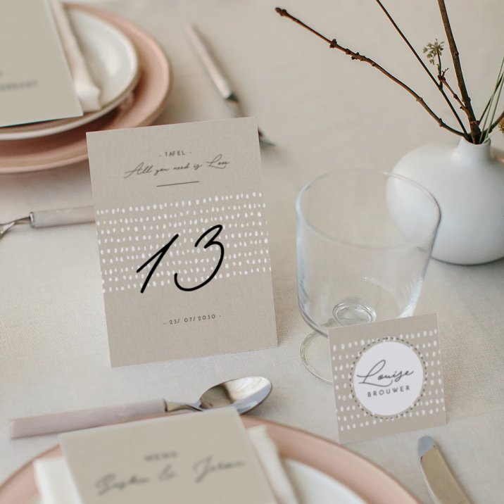 Plaats het tafelnummerkaartje in het midden van de tafel zodat het goed zichtbaar is voor jullie gasten. Zo vinden ze snel hun plek na het aflezen van hun tafelnummer op het tafelplan.