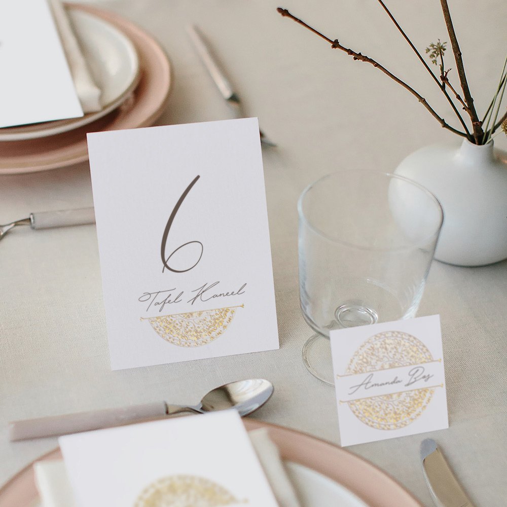 Plaats het tafelnummerkaartje in het midden van de tafel zodat het goed zichtbaar is voor jullie gasten. Zo vinden ze snel hun plek na het aflezen van hun tafelnummer op het tafelplan.