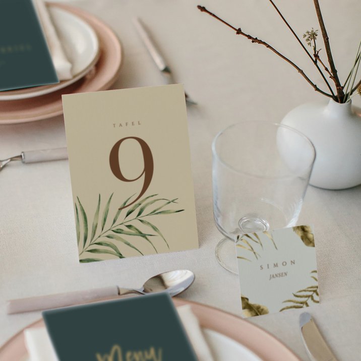 Plaats het tafelnummerkaartje in het midden van de tafel zodat het goed zichtbaar is voor jullie gasten. Zo vinden ze snel hun plek na het aflezen van hun tafelnummer op het tafelplan.