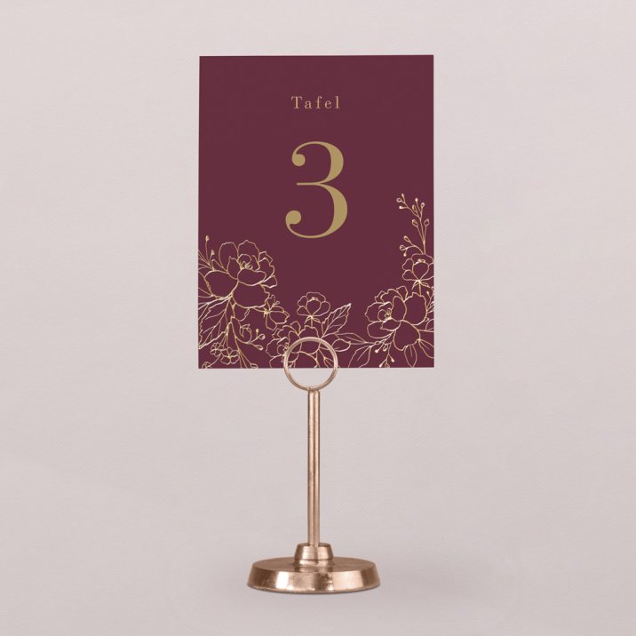 Plaats het tafelnummerkaartje in het midden van de tafel zodat het goed zichtbaar is voor jullie gasten. Zo vinden ze snel hun plek na het aflezen van hun tafelnummer op het tafelplan.