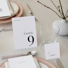Plaats het tafelnummerkaartje in het midden van de tafel zodat het goed zichtbaar is voor jullie gasten. Zo vinden ze snel hun plek na het aflezen van hun tafelnummer op het tafelplan.