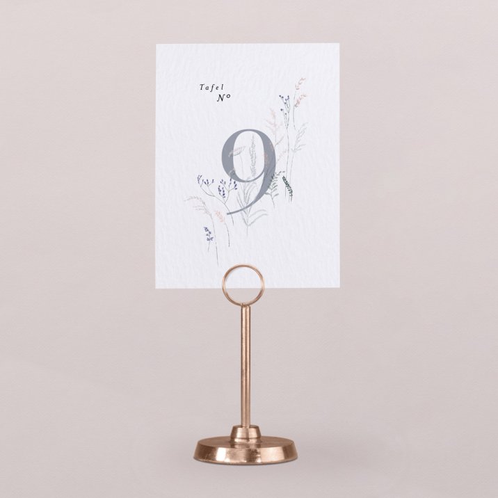 Plaats het tafelnummerkaartje in het midden van de tafel zodat het goed zichtbaar is voor jullie gasten. Zo vinden ze snel hun plek na het aflezen van hun tafelnummer op het tafelplan.