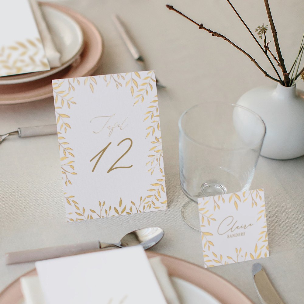 Plaats het tafelnummerkaartje in het midden van de tafel zodat het goed zichtbaar is voor jullie gasten. Zo vinden ze snel hun plek na het aflezen van hun tafelnummer op het tafelplan.