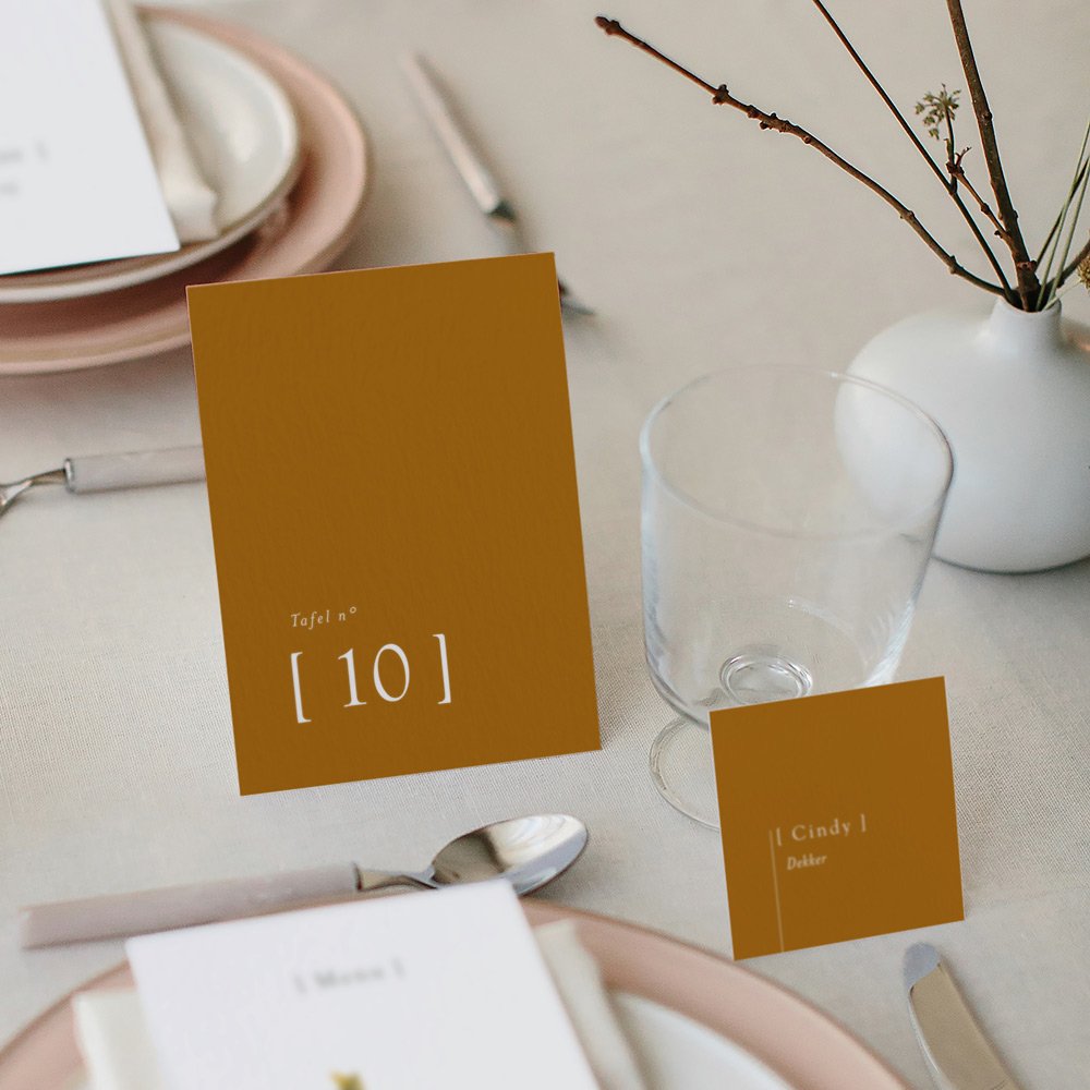 Plaats het tafelnummerkaartje in het midden van de tafel zodat het goed zichtbaar is voor jullie gasten. Zo vinden ze snel hun plek na het aflezen van hun tafelnummer op het tafelplan.