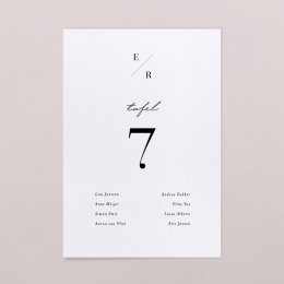 Plaats het tafelnummerkaartje in het midden van de tafel zodat het goed zichtbaar is voor jullie gasten. Zo vinden ze snel hun plek na het aflezen van hun tafelnummer op het tafelplan.