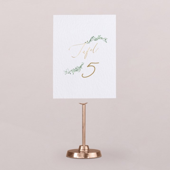 Plaats het tafelnummerkaartje in het midden van de tafel zodat het goed zichtbaar is voor jullie gasten. Zo vinden ze snel hun plek na het aflezen van hun tafelnummer op het tafelplan.