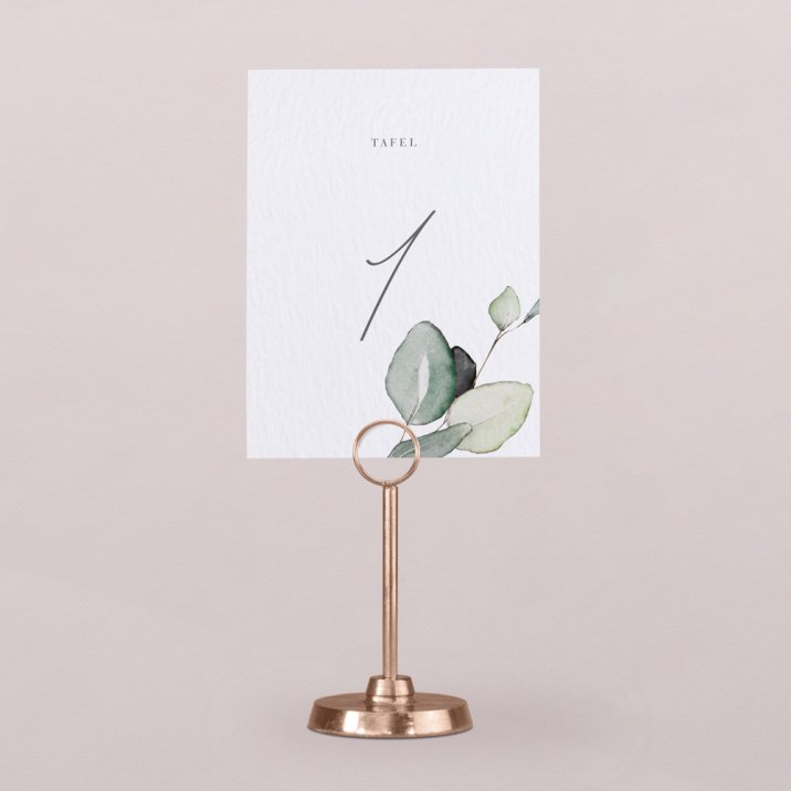 Plaats het tafelnummerkaartje in het midden van de tafel zodat het goed zichtbaar is voor jullie gasten. Zo vinden ze snel hun plek na het aflezen van hun tafelnummer op het tafelplan.
