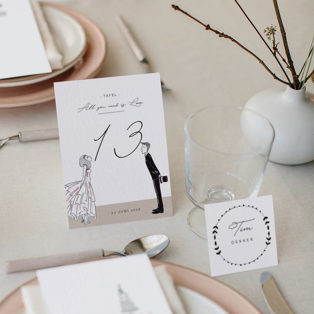 Plaats het tafelnummerkaartje in het midden van de tafel zodat het goed zichtbaar is voor jullie gasten. Zo vinden ze snel hun plek na het aflezen van hun tafelnummer op het tafelplan.