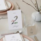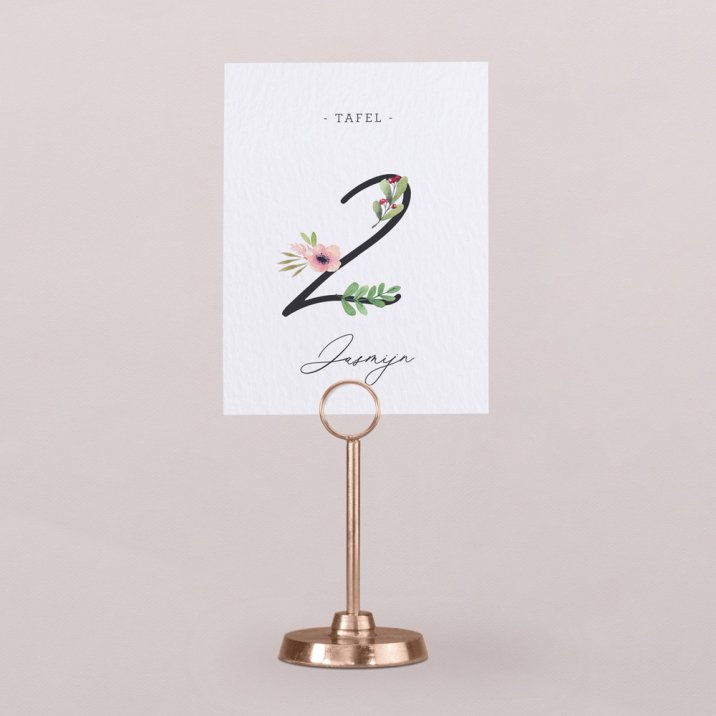 Plaats het tafelnummerkaartje in het midden van de tafel zodat het goed zichtbaar is voor jullie gasten. Zo vinden ze snel hun plek na het aflezen van hun tafelnummer op het tafelplan.