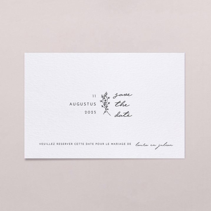 Met een save the date kaart kondig je de trouwdatum aan. Zodra de datum van jullie bruiloft bekend is, stuur je de genodigden alvast een save the date kaart zodat ze deze bijzondere dag vrij kunnen houden voor jullie huwelijk. Vaak wordt een save the date 4 tot 12 maanden van te voren verstuurd. Zo'n zes tot acht weken voor de huwelijksdatum verstuur je de trouwkaarten. Bij Cotton Bird vind je save the date kaarten en trouwkaarten in dezelfde stijl. De save the date kaart bevat alleen de noodzakelijke informatie, zoals de namen van de verloofden, de trouwdatum en feestlocatie. Omdat uitgebreidere informatie op de trouwuitnodiging wordt gegeven, worden de save the date kaarten doorgaans afgesloten met de tekst: de officiële uitnodiging volgt later.