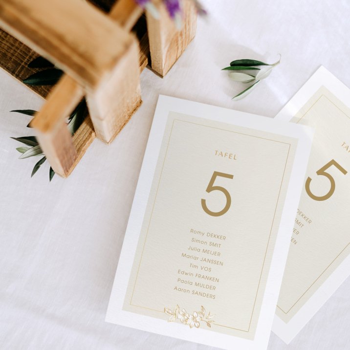 Een grote kaart per tafel met daarop de namen en het tafelnummer, of tafelnaam als jullie een thema hebben gekozen.