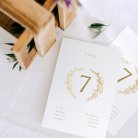 Een grote kaart per tafel met daarop de namen en het tafelnummer, of tafelnaam als jullie een thema hebben gekozen.