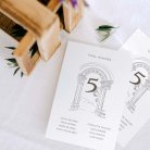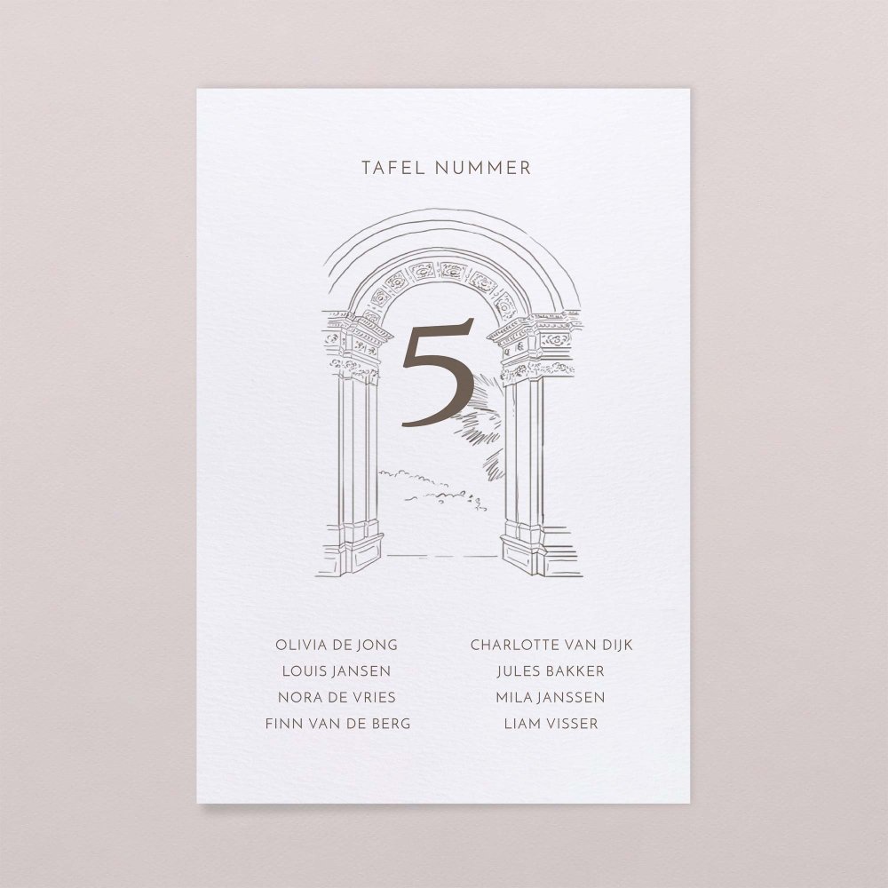 Een grote kaart per tafel met daarop de namen en het tafelnummer, of tafelnaam als jullie een thema hebben gekozen.
