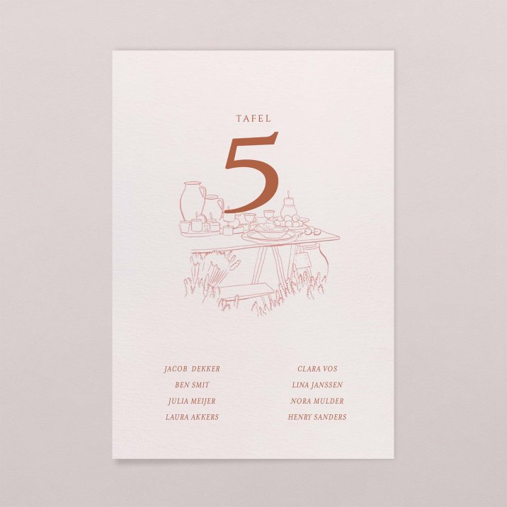 Een grote kaart per tafel met daarop de namen en het tafelnummer, of tafelnaam als jullie een thema hebben gekozen.