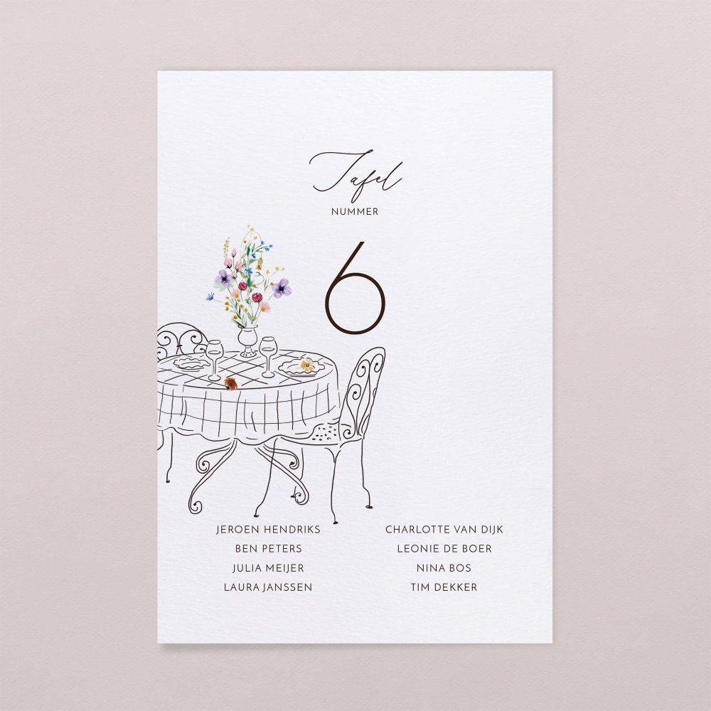 Een grote kaart per tafel met daarop de namen en het tafelnummer, of tafelnaam als jullie een thema hebben gekozen.