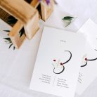 Een grote kaart per tafel met daarop de namen en het tafelnummer, of tafelnaam als jullie een thema hebben gekozen.