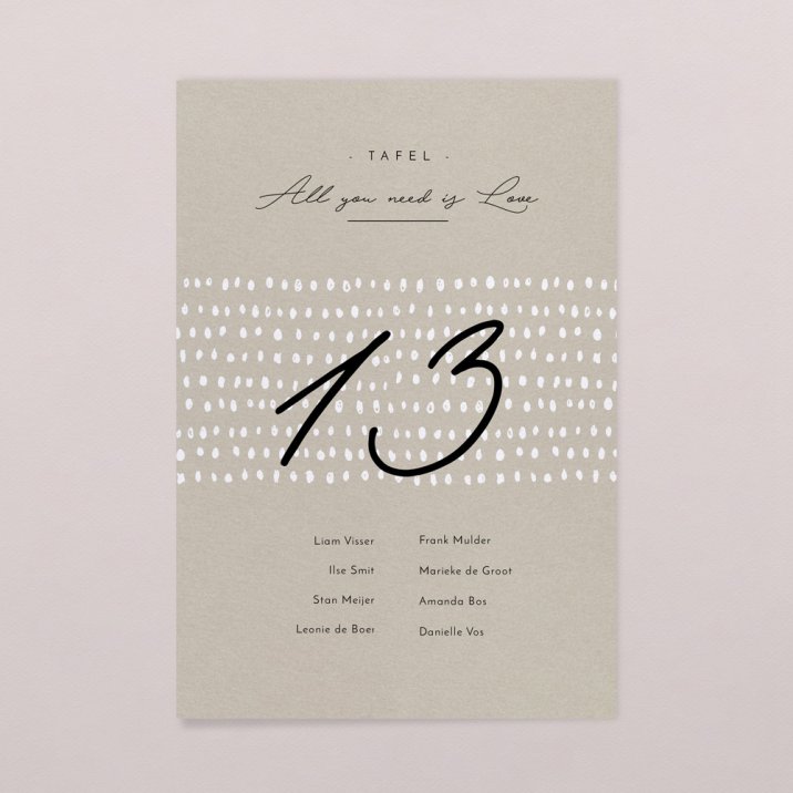 Een grote kaart per tafel met daarop de namen en het tafelnummer, of tafelnaam als jullie een thema hebben gekozen.