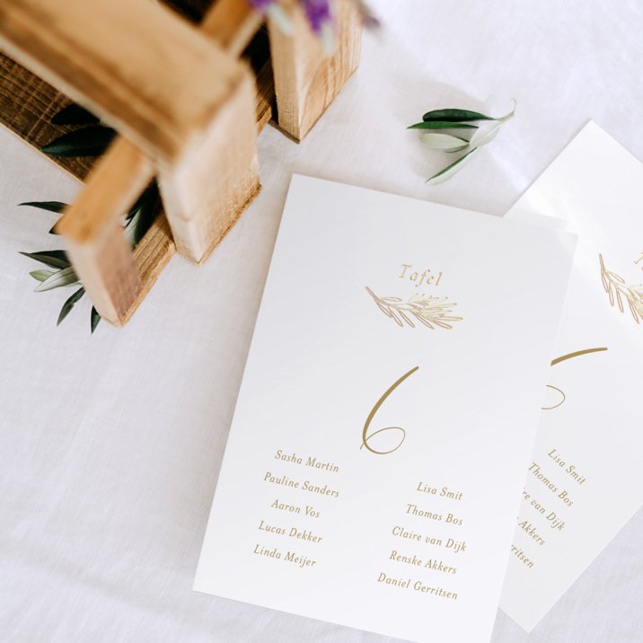Een grote kaart per tafel met daarop de namen en het tafelnummer, of tafelnaam als jullie een thema hebben gekozen.
