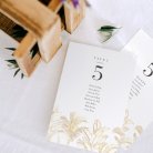 Een grote kaart per tafel met daarop de namen en het tafelnummer, of tafelnaam als jullie een thema hebben gekozen.