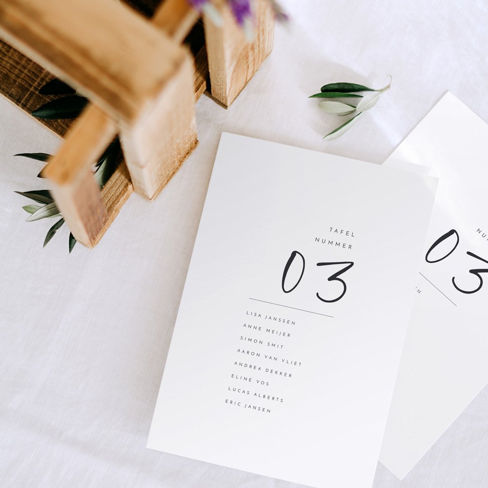 Een grote kaart per tafel met daarop de namen en het tafelnummer, of tafelnaam als jullie een thema hebben gekozen.