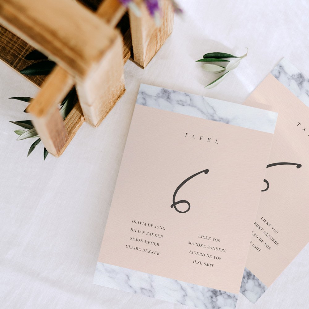 Een grote kaart per tafel met daarop de namen en het tafelnummer, of tafelnaam als jullie een thema hebben gekozen.