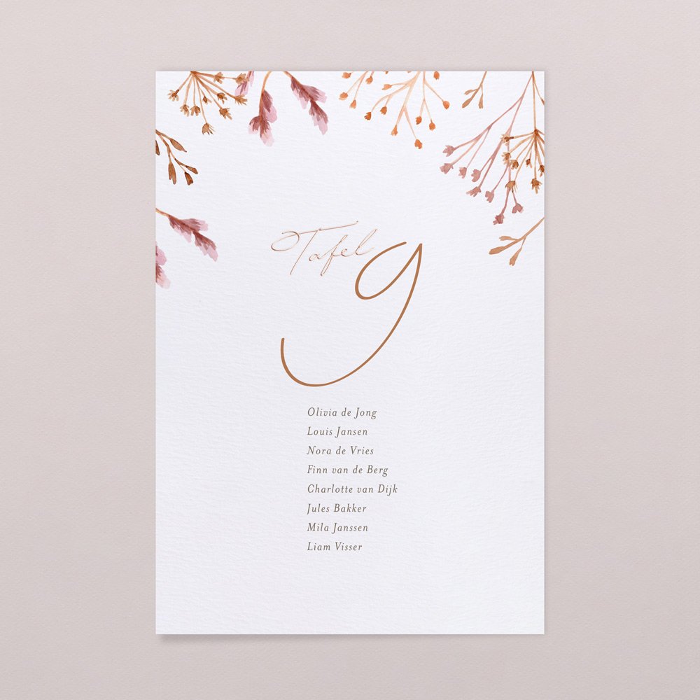Een grote kaart per tafel met daarop de namen en het tafelnummer, of tafelnaam als jullie een thema hebben gekozen.