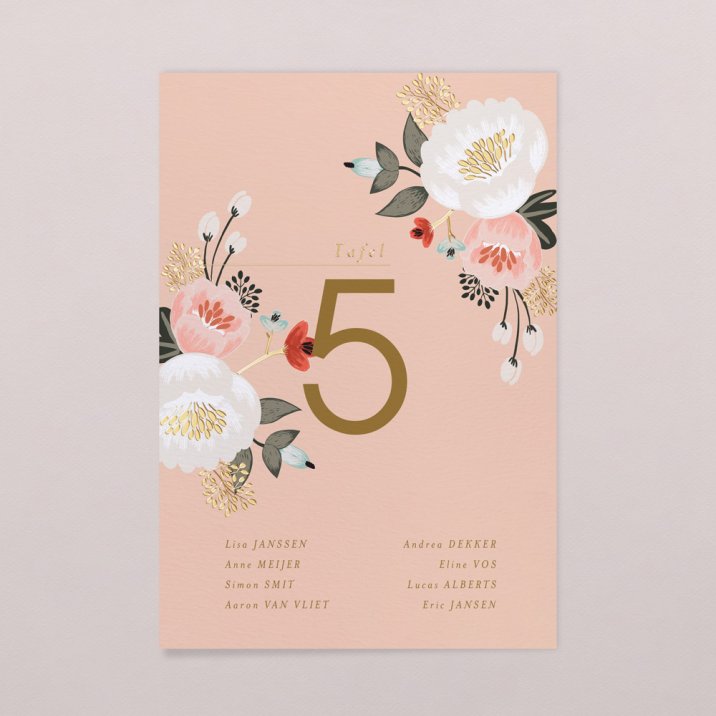 Een grote kaart per tafel met daarop de namen en het tafelnummer, of tafelnaam als jullie een thema hebben gekozen.