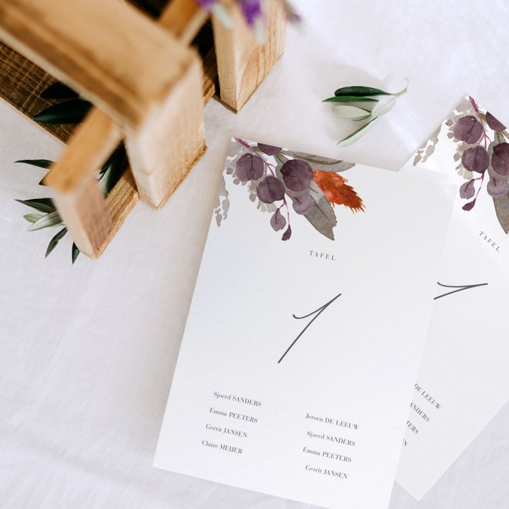 Een grote kaart per tafel met daarop de namen en het tafelnummer, of tafelnaam als jullie een thema hebben gekozen.