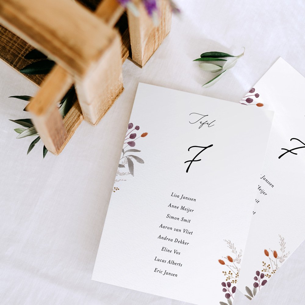 Een grote kaart per tafel met daarop de namen en het tafelnummer, of tafelnaam als jullie een thema hebben gekozen.