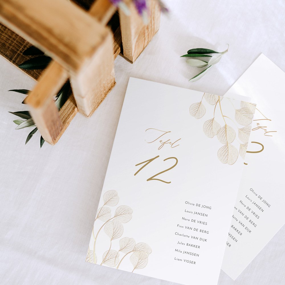 Een grote kaart per tafel met daarop de namen en het tafelnummer, of tafelnaam als jullie een thema hebben gekozen.