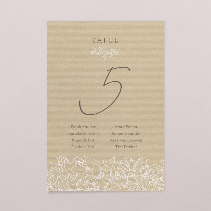 Een grote kaart per tafel met daarop de namen en het tafelnummer, of tafelnaam als jullie een thema hebben gekozen.