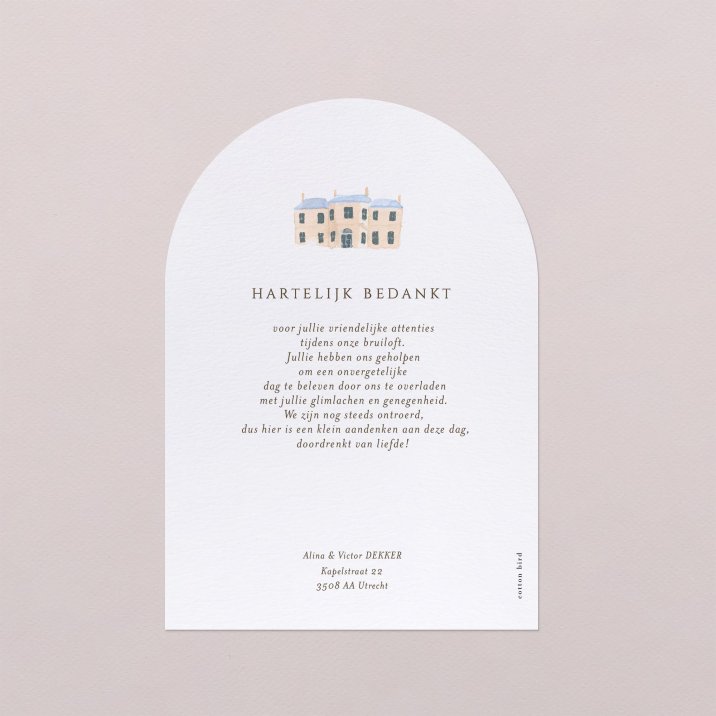 Deze bedankkaart wordt gekenmerkt door zijn afgeronde bovenranden in de vorm van een boog en kan aan de voor- en achterkant worden gepersonaliseerd met een lief berichtje.