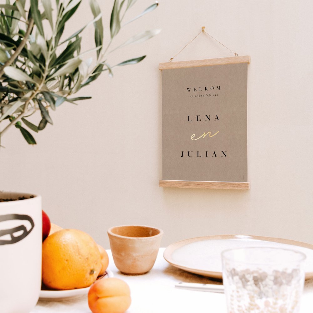 Personaliseer het trouwbord naar wens: "Welkom", "Welcome", "Bienvenu", "Welkom op de bruiloft van ..."