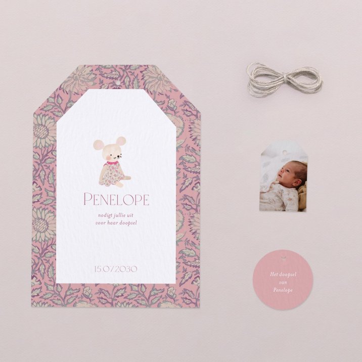 Vier de doop van je baby met de Ysalia uitnodigingskaart. Geïnspireerd door de bohemien creaties van Louise Misha, is deze uitnodigingskaart geïllustreerd met wilde bloemen in zachte, rustgevende roze tinten. Een elegant en verfijnd ontwerp dat perfect is om de doop van je kind aan te kondigen.