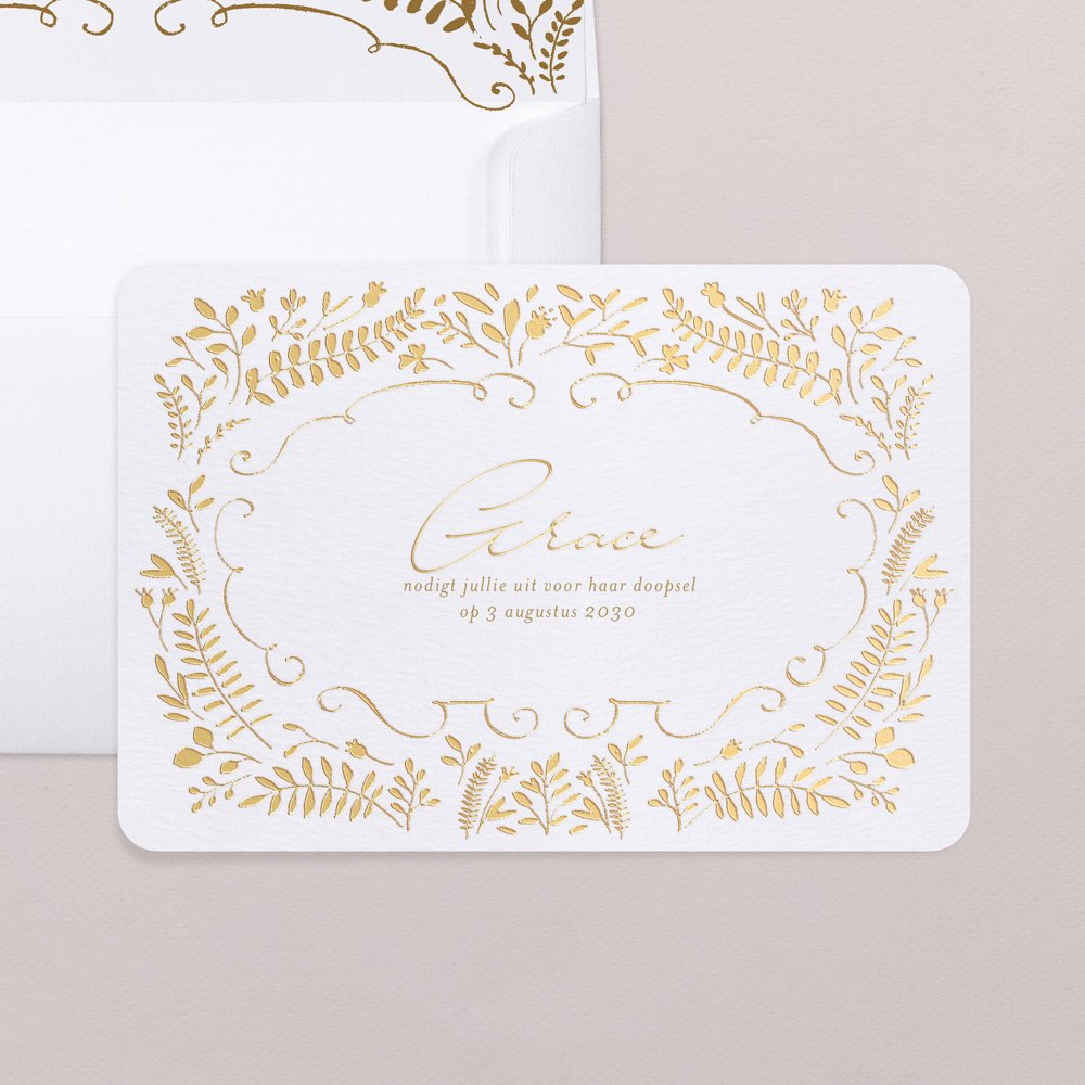 Kader de naam van je kind in met een mooi botanisch tafereel in goudfolie. De speelse takjes en krulletjes kondigen op een joviale wijze het heugelijke moment van samenzijn aan. De uitnodiging Golden Fields is ideaal voor een doop, communie of lentefeest!