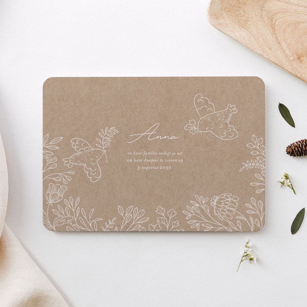 Samenzijn... Samen een moment van bezinning rond het plechtige moment van doop, communie en lentefeest. Verras vrienden en familie met deze hedendaagse en trendy uitndoding door lieve witte lijntekeningen van vogeltjes op een hippe kraft achtergrond.
