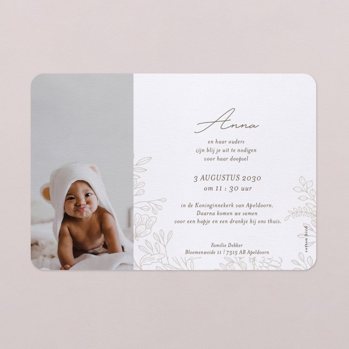 Deze uitnodiging voor doop, communie of lentefeest is een enkele kaart, liggend formaat. De afgeronde hoeken geeft een trendy en zachte uitstraling.