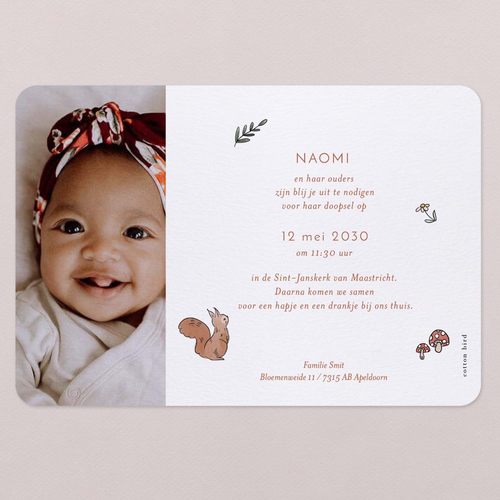 Geïnspireerd op kinderboeken, vertellen deze kleine eekhoorntjes een nieuw hoofdstuk uit het leven van je kindje: Het doopsel. Een uiterst schattige doopkaart die met veel enthousiasme familie en vrienden zal uitnodigen voor het gezellige doopfeest van je dochter of zoon.