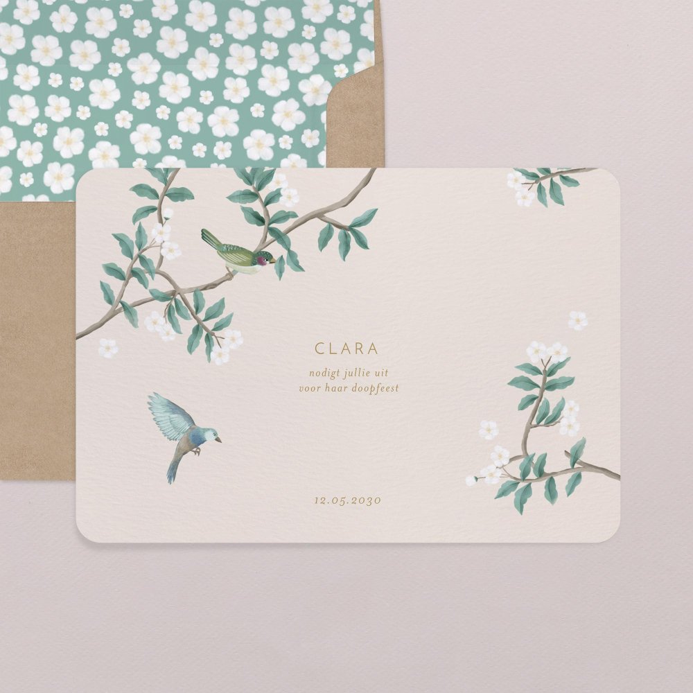 De doopkaart Vredig is gevuld met groene takjes, witte jasmijn bloemetjes en vogeltjes in zachte kleuren. Deze uitnodiging zal je foto dan ook prachtig in de kijker zetten. Kondig de doop van je kindje aan met een vleugje po?zie!