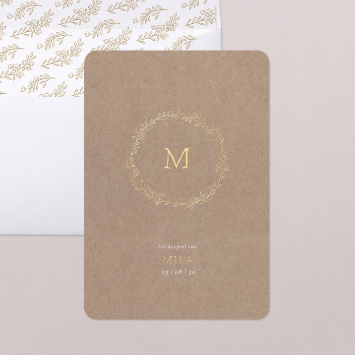 Alle aandacht gaat naar de naam van jullie kind die schittert in goudfolie op kraft! Een strakke tekstopmaak in combinatie met een trendy lettertype. Kondig het doop, communie of lentefeest aan in een vintage-stijl met het model Golden Leaves.