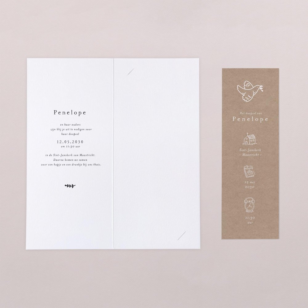 Op de doopkaart Magdalena draagt een witte vredesduif een olijftakje, symbool van vrede en vertrouwen. Dit eenvoudig design, met een mooi contrast tussen wit en kraft, nodigt familie en vrienden uit voor de doop van je kindje en het aansluitende doopfeest.
