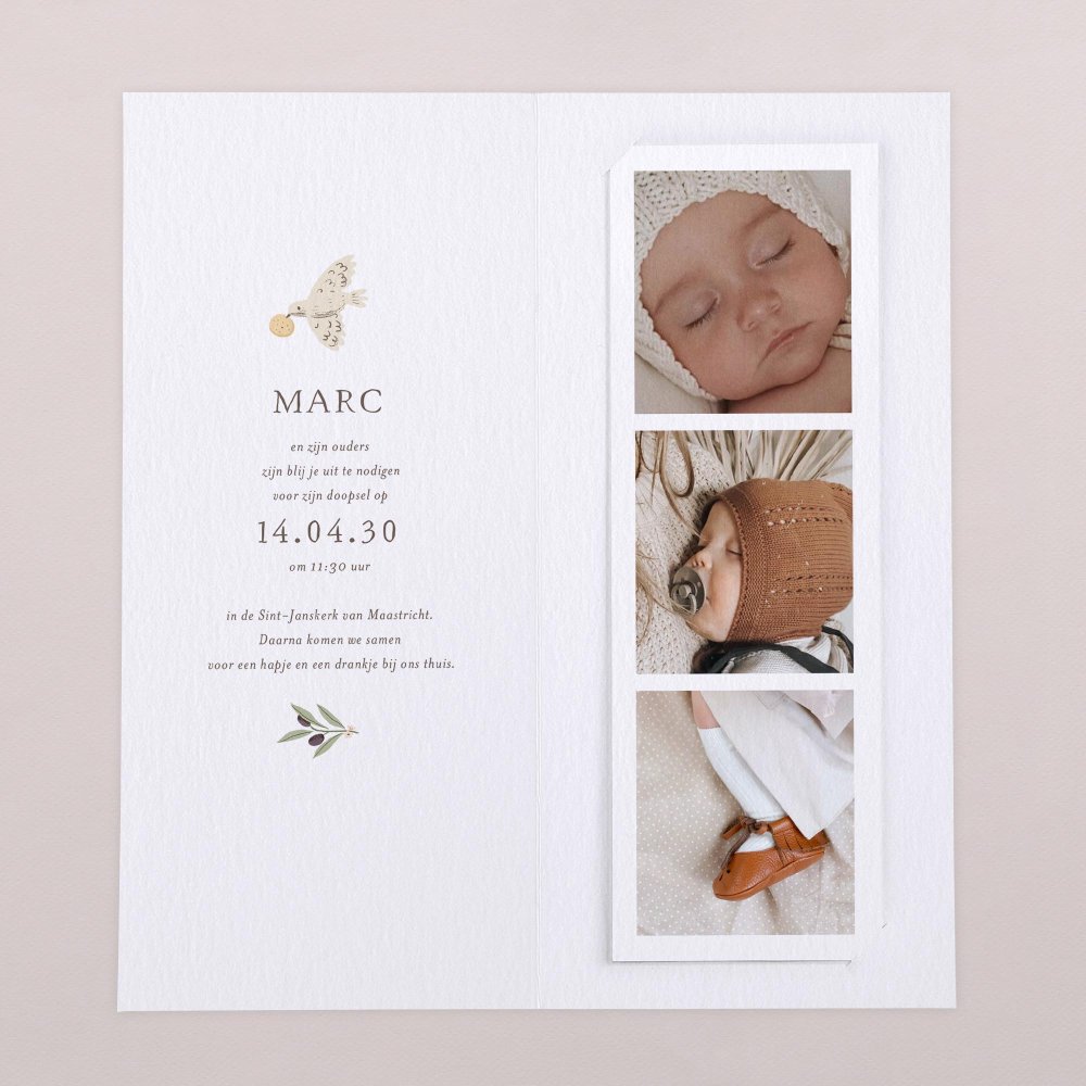 Door een zee van symbolische graan, olijf en druivenblaadjes vliegt dit kleine duifje razendsnel naar de doop van je kindje voor het brengen van de hostie. Deze doopkaart Natana?l kondigt in zachte kleuren het doopfeest aan familie en vrienden aan.