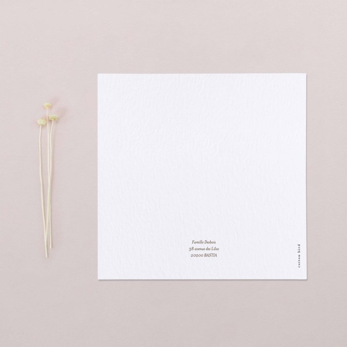 Deze doopuitnodiging wordt gepresenteerd als een gevouwen vierkante kaart, gevouwen in het midden. Twee perforaties aan de voorkant van de kaart maken het mogelijk om een steeltje gedroogde bloemen door te steken (optioneel en tegen meerprijs).