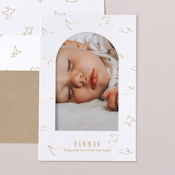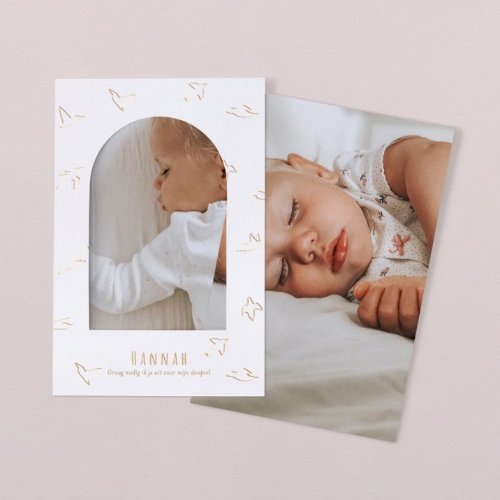 Op onze Precious Origami III-uitnodiging omringt een wolk van gouden duiven de mooie foto van je toekomstig gedoopte kleine. Door de combinatie van traditionele doopsymbolen en eigentijdse rondingen, zal dit model alle uitgenodigde generaties aanspreken.